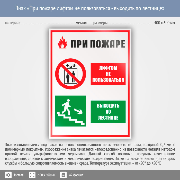 Знак «При пожаре лифтом не пользоваться - выходить по лестнице», КЗ-73 (металл, 400х600 мм) в Рыбинске купить