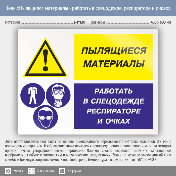 Знак «Пылящиеся материалы - работать в спецодежде, респираторе и очках», КЗ-79 (металл, 600х400 мм) в Рыбинске купить