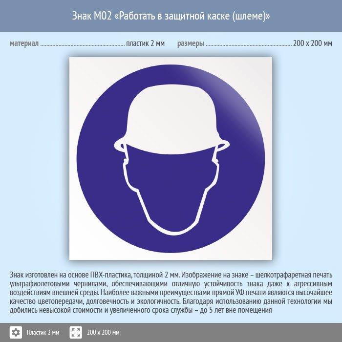 Знак M02 «Работать в защитной каске (шлеме)» (пластик, 200х200 мм) в Рыбинске купить