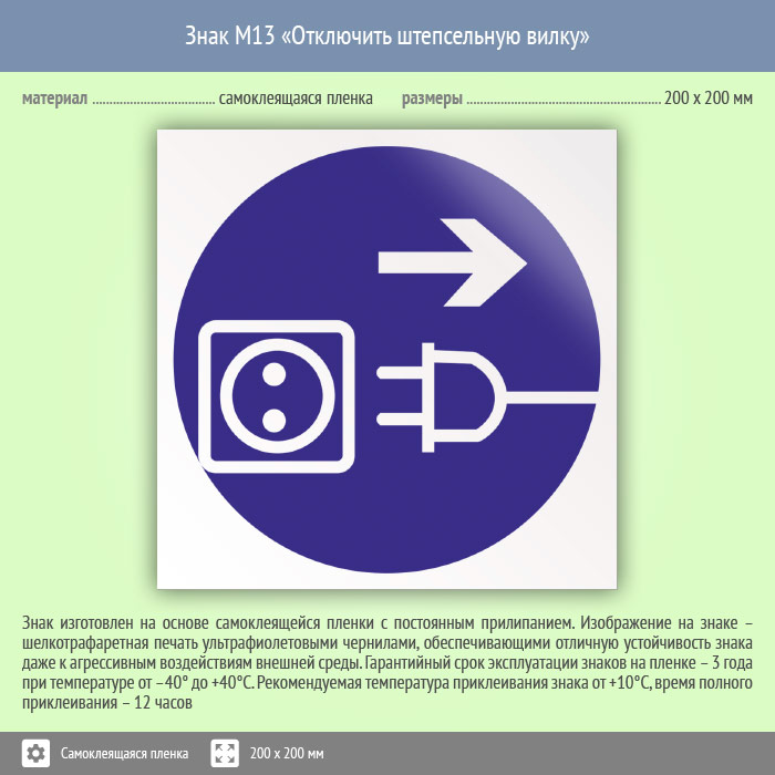 Знак M13 «Отключить штепсельную вилку» (пленка, 200х200 мм) в Рыбинске купить