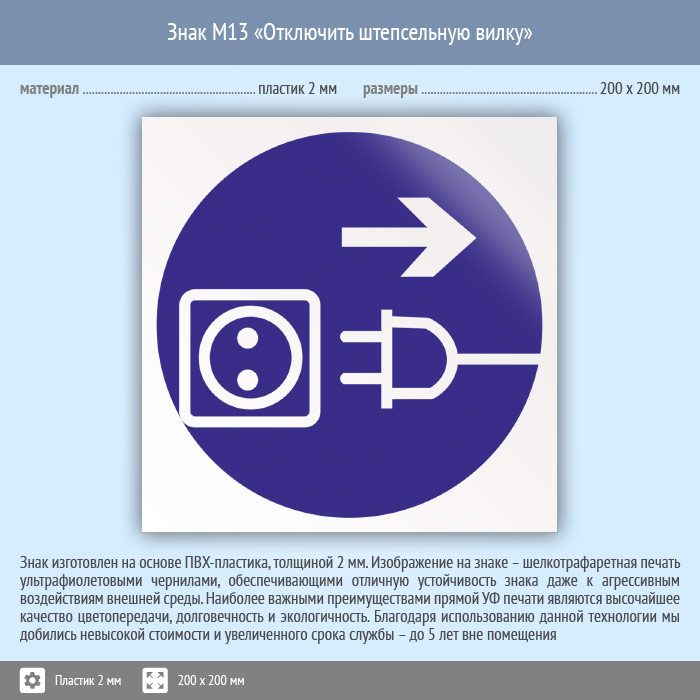 Знак M13 «Отключить штепсельную вилку» (пластик, 200х200 мм) в Рыбинске купить