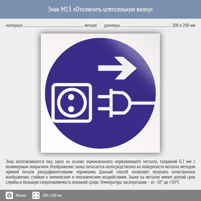 Знак M13 «Отключить штепсельную вилку» (металл, 200х200 мм) в Рыбинске купить