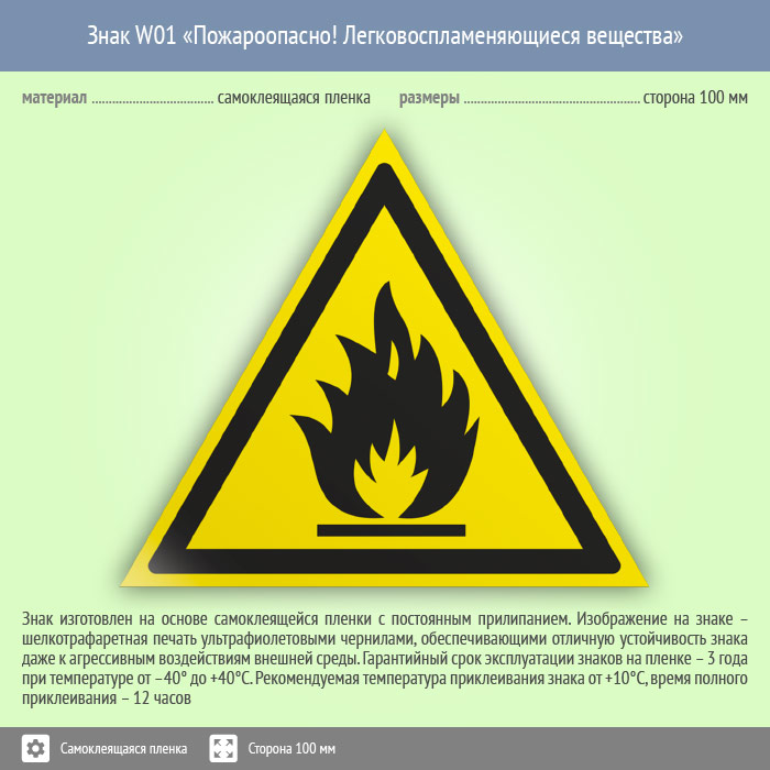 Знак W01 «Пожароопасно! легковоспламеняющиеся вещества» (пленка, сторона 100 мм) в Рыбинске купить