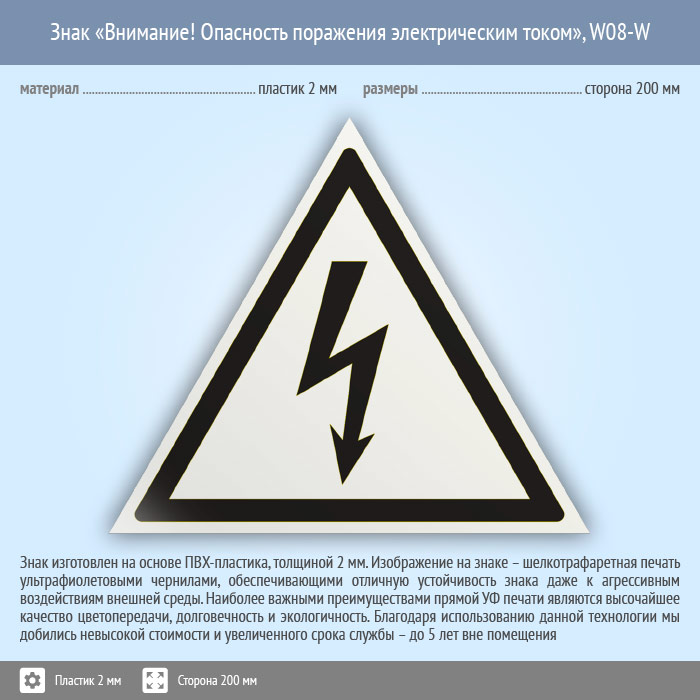 Знак W08-W «Внимание! опасность поражения электрическим током» (белый, пластик, сторона 200 мм) в Рыбинске купить