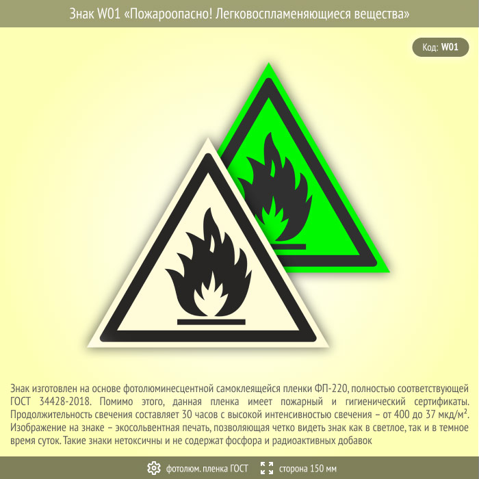 Знак W01 «Пожароопасно! легковоспламеняющиеся вещества» (фотолюминесцентная пленка ГОСТ 34428-2018, сторона 150 мм) в Рыбинске купить