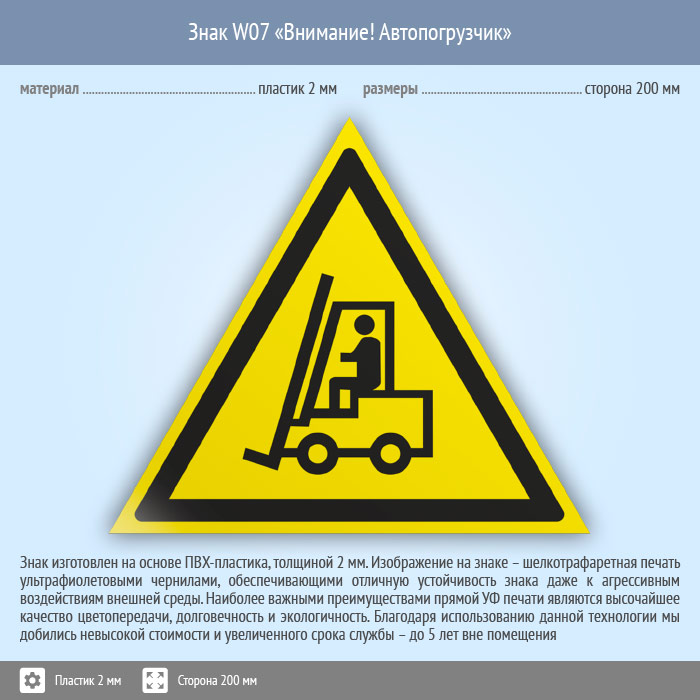 Знак W07 «Внимание! автопогрузчик» (пластик, сторона 200 мм) в Рыбинске купить