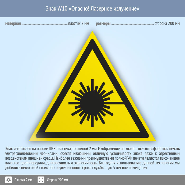 Знак W10 «Опасно! лазерное излучение» (пластик, сторона 200 мм) в Рыбинске купить