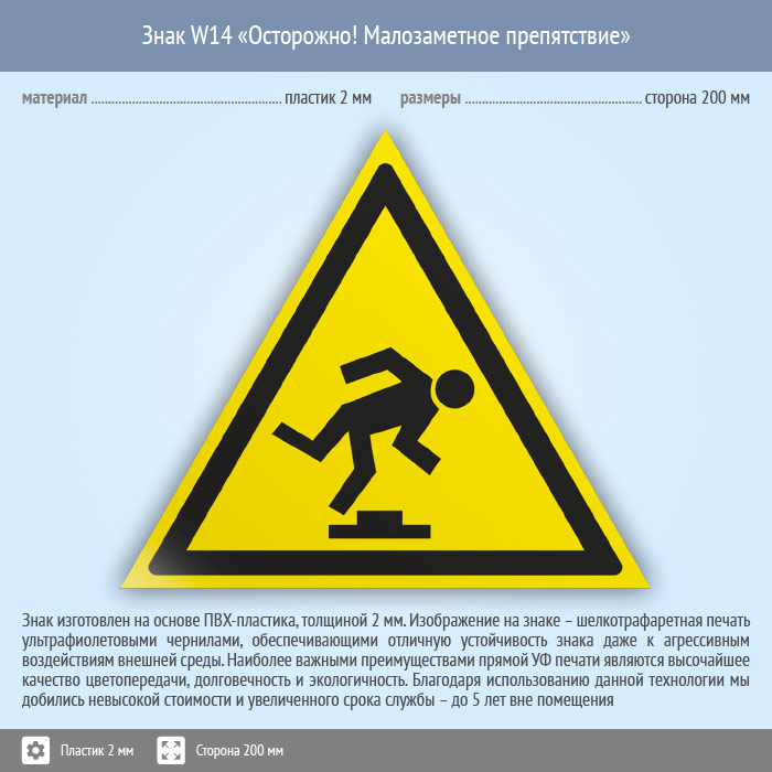 Знак W14 «Осторожно! малозаметное препятствие» (пластик, сторона 200 мм) в Рыбинске купить