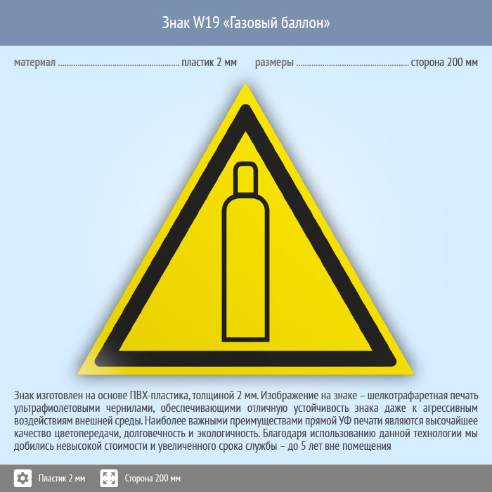 Знак W19 «Газовый баллон» (пластик, сторона 200 мм) в Рыбинске купить
