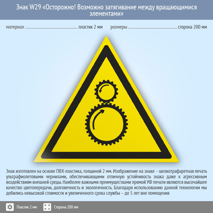Знак W29 «Осторожно! возможно затягивание между вращающимися элементами» (пластик, сторона 200 мм) в Рыбинске купить