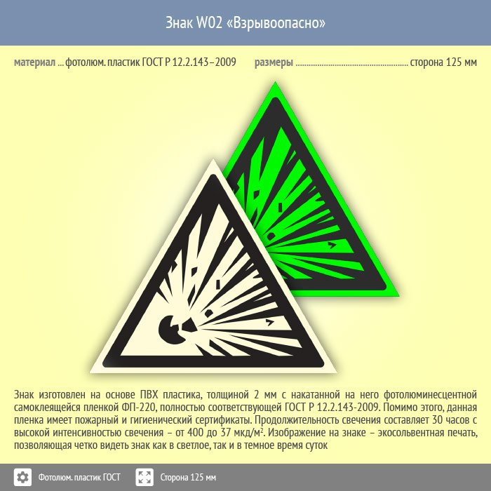 Знак W02 «Взрывоопасно» (фотолюминесцентный пластик ГОСТ 34428-2018, сторона 125 мм) в Рыбинске купить
