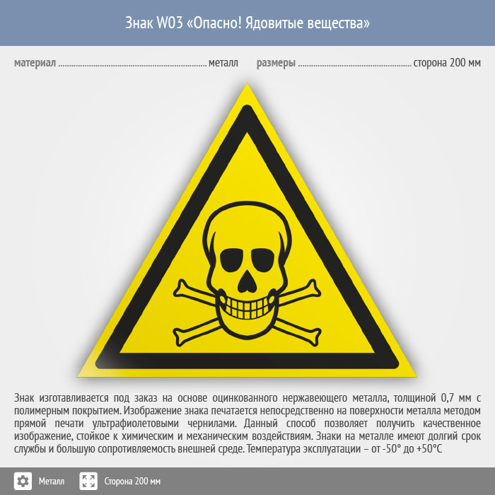 Знак W03 «Опасно! ядовитые вещества» (металл, сторона 200 мм) в Рыбинске купить