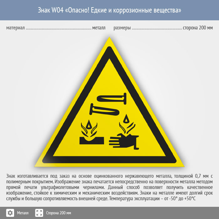 Знак W04 «Опасно! едкие и коррозионные вещества» (металл, сторона 200 мм) в Рыбинске купить