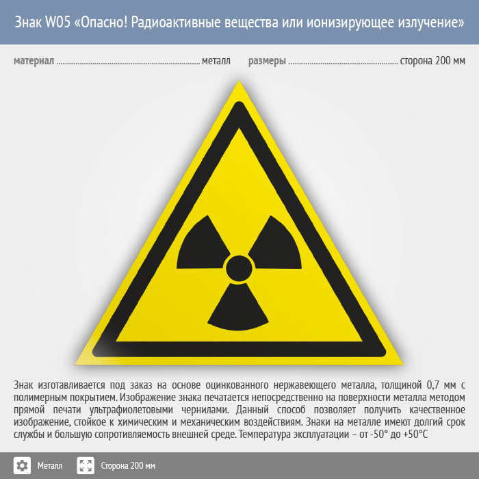 Знак W05 «Опасно! радиоактивные вещества или ионизирующее излучение» (металл, сторона 200 мм) в Рыбинске купить