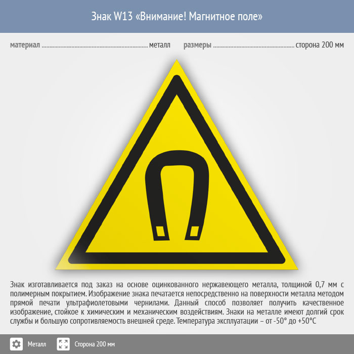 Знак W13 «Внимание! магнитное поле» (металл, сторона 200 мм) в Рыбинске купить