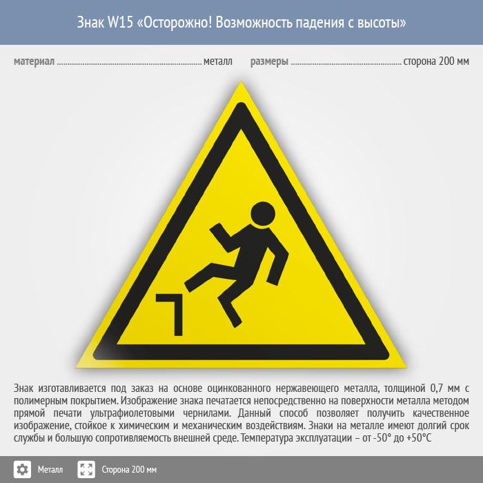 Знак W15 «Осторожно! возможность падения с высоты» (металл, сторона 200 мм) в Рыбинске купить