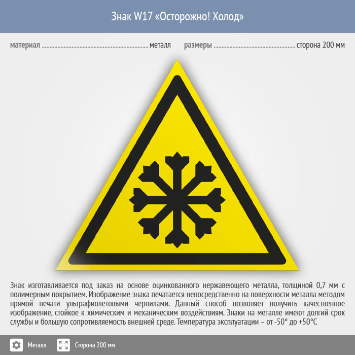 Знак W17 «Осторожно! холод» (металл, сторона 200 мм) в Рыбинске купить