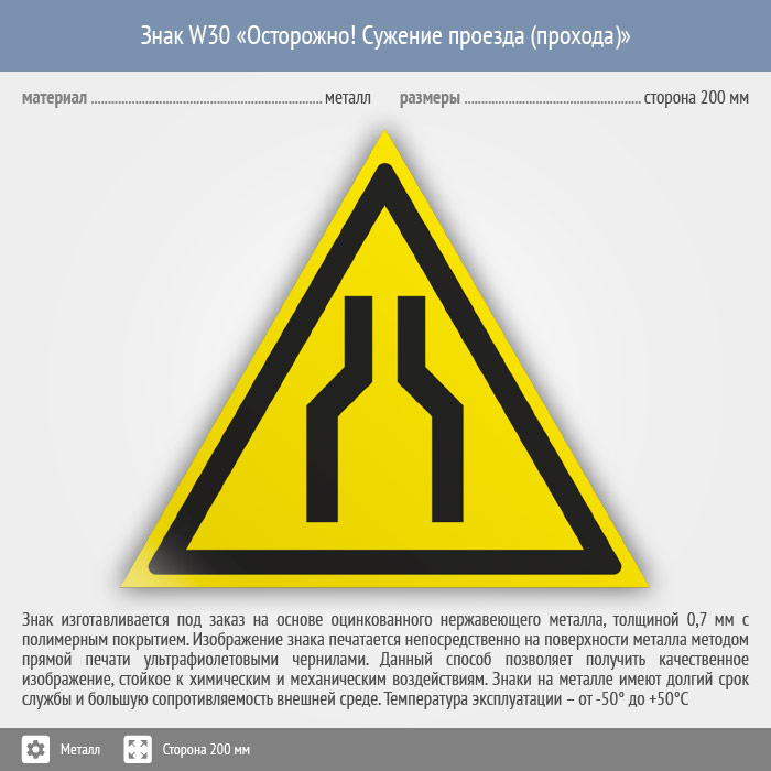 Знак W30 «Осторожно! сужение проезда (прохода)» (металл, сторона 200 мм) в Рыбинске купить