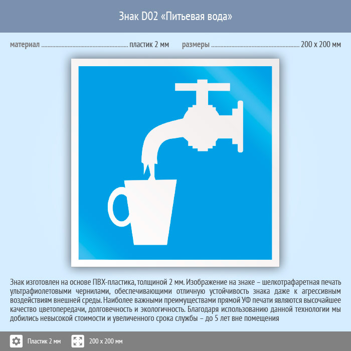 Знак D02 «Питьевая вода» (пластик, 200х200 мм) в Рыбинске купить