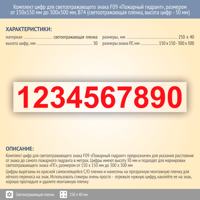 Комплект цифр для светоотражающего знака F09 «Пожарный гидрант», размером от 150х150 мм до 300х300 мм, В74 (светоотражающая пленка, 250х40 мм, высота цифр - 30 мм) в Рыбинске купить