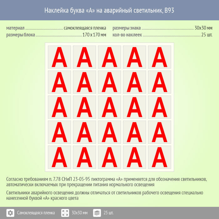 Наклейка буква «А» на аварийный светильник, B93 (пленка, 30х30 мм, блок 25 штук, 170х170 мм) в Рыбинске купить
