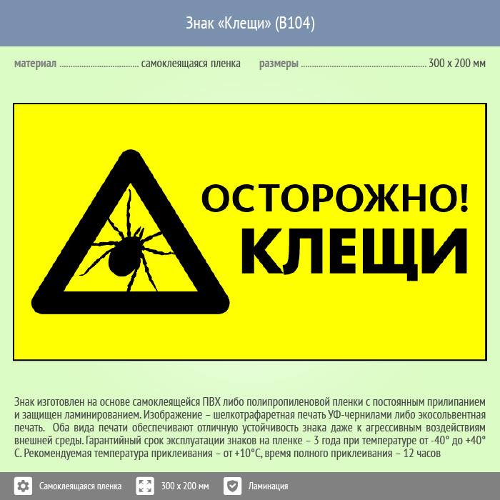 Знак «Осторожно! Клещи», B104 (пленка c ламинированием, 400х300 мм) в Рыбинске купить