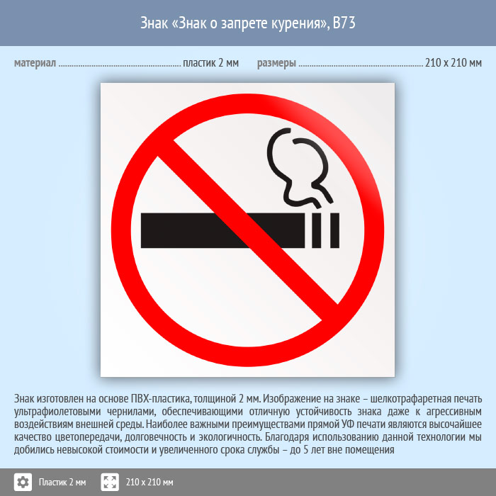 Знак «Знак о запрете курения», B73 (пластик, 210х210 мм) в Рыбинске купить