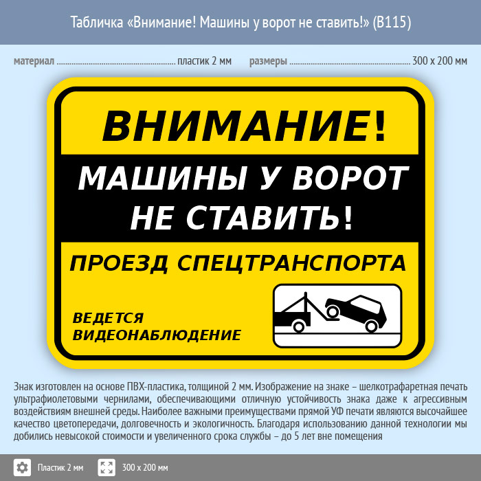 Табличка «Внимание! Машины у ворот не ставить!», B115 (пластик, 300х200 мм) в Рыбинске купить