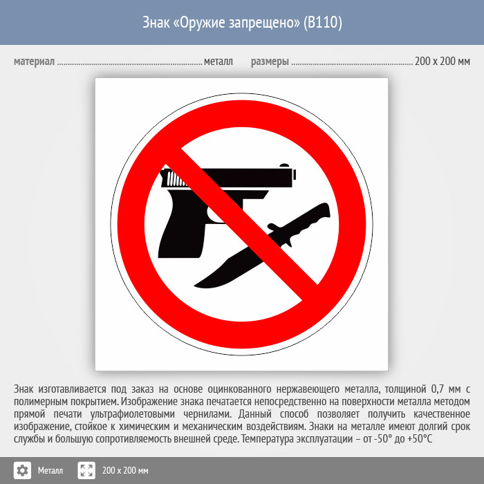 Знак «Оружие запрещено», B110 (металл, 200х200 мм) в Рыбинске купить