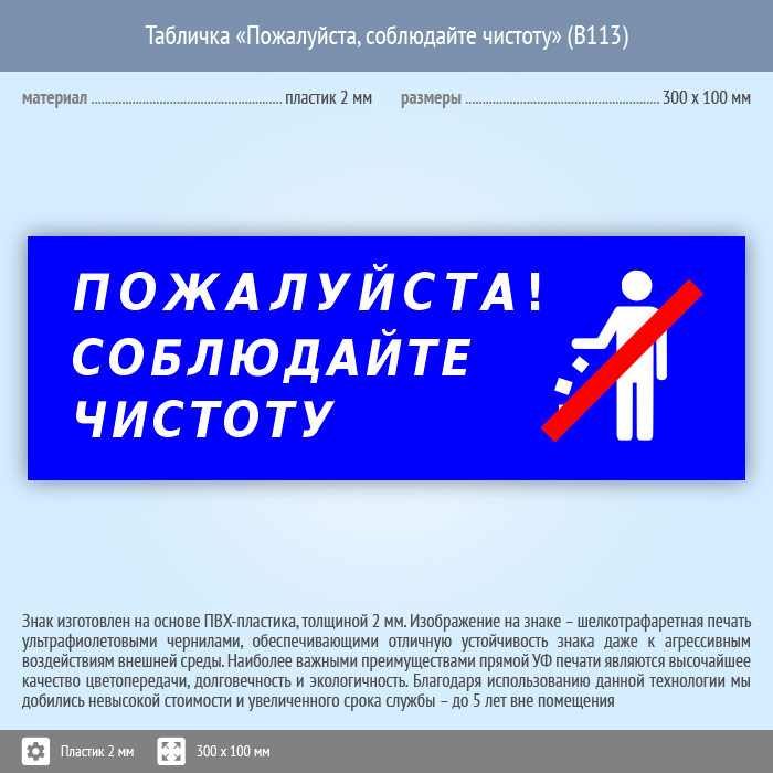Табличка «Пожалуйста, соблюдайте чистоту», B113 (пластик, 300х100 мм) в Рыбинске купить
