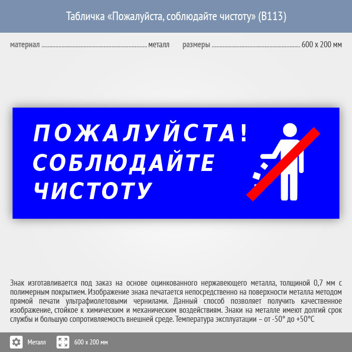 Табличка «Пожалуйста, соблюдайте чистоту», B113 (металл, 600х200 мм) в Рыбинске купить
