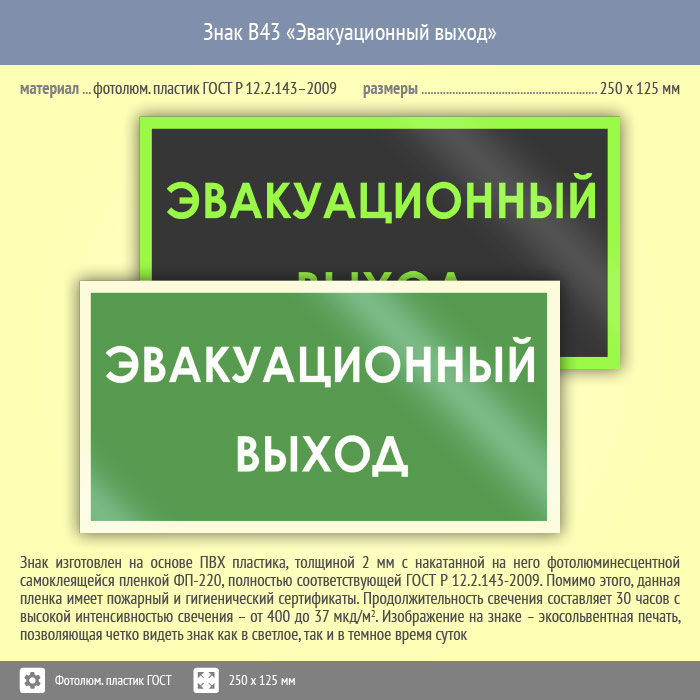 Знак B43 «Эвакуационный выход» (фотолюминесцентный пластик ГОСТ 34428-2018, 250х125 мм) в Рыбинске купить