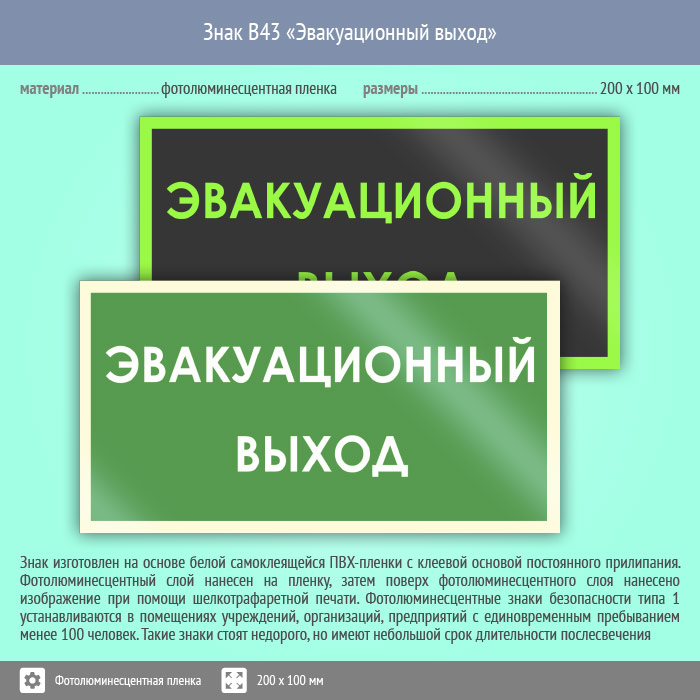 Знак B43 «Эвакуационный выход» (фотолюминесцентная пленка ГОСТ 34428-2018, 200х100 мм) в Рыбинске купить