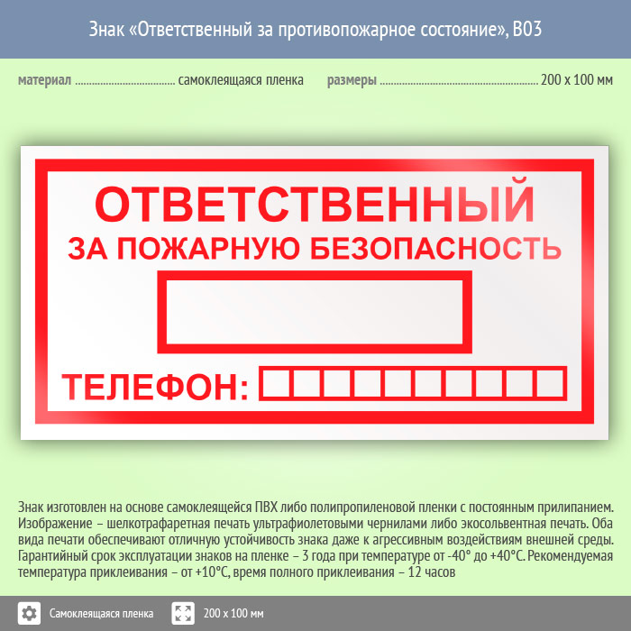 Знак «Ответственный за пожарную безопасность», B03 (пленка, 200х100 мм) в Рыбинске купить