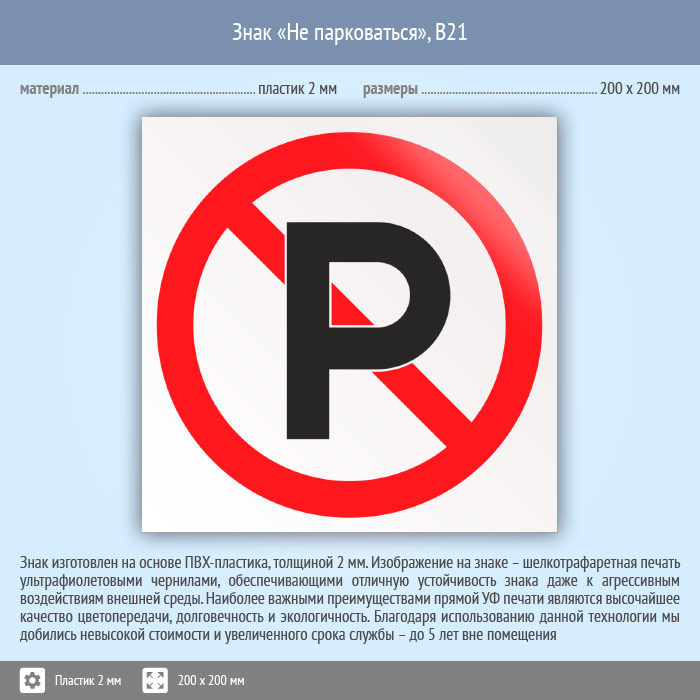 Знак «Не парковаться», B21 (пластик, 200х200 мм) в Рыбинске купить