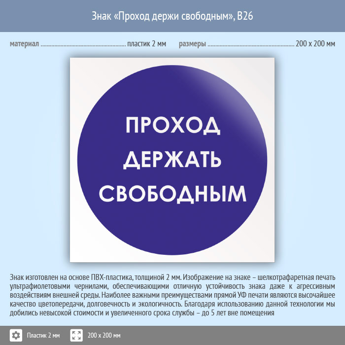 Знак «Проход держи свободным», B26 (пластик, 200х200 мм) в Рыбинске купить
