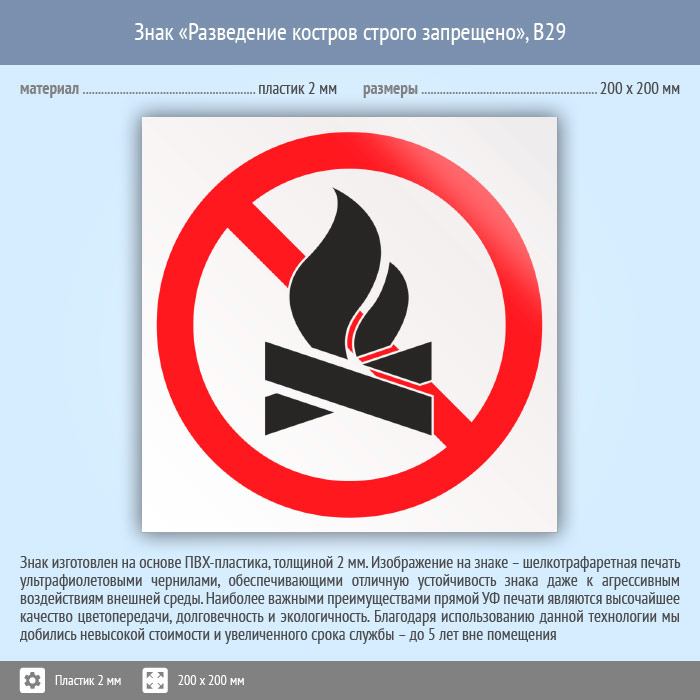 Знак «Разведение костров строго запрещено», B29 (пластик, 200х200 мм) в Рыбинске купить