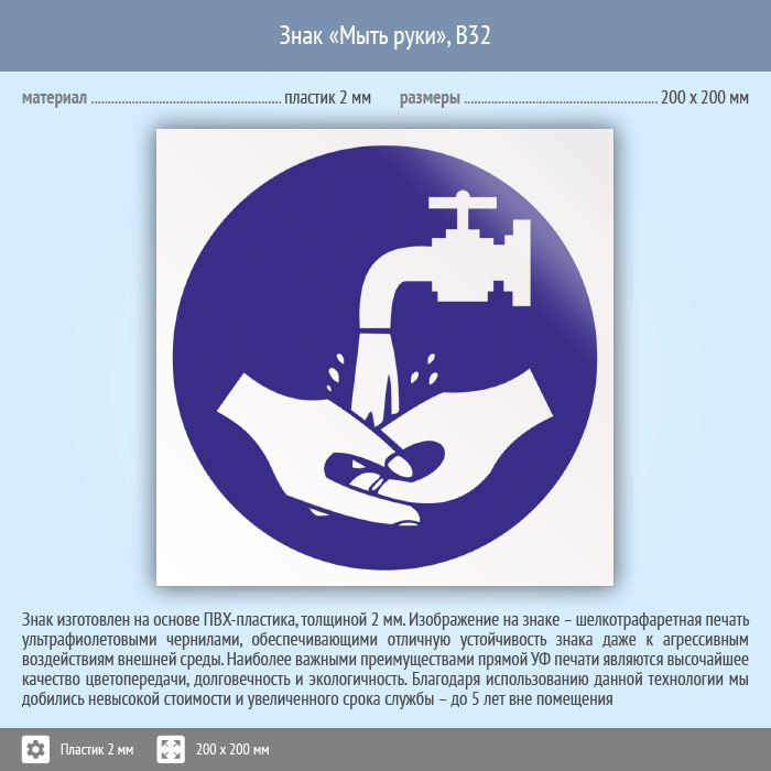 Знак «Мыть руки», B32 (пластик, 200х200 мм) в Рыбинске купить