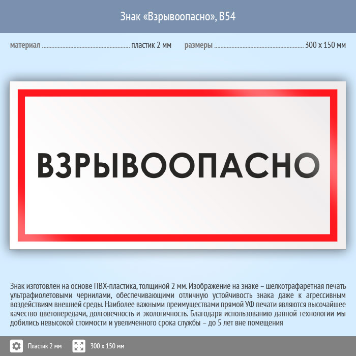 Знак «Взрывоопасно», B54 (пластик, 300х150 мм) в Рыбинске купить