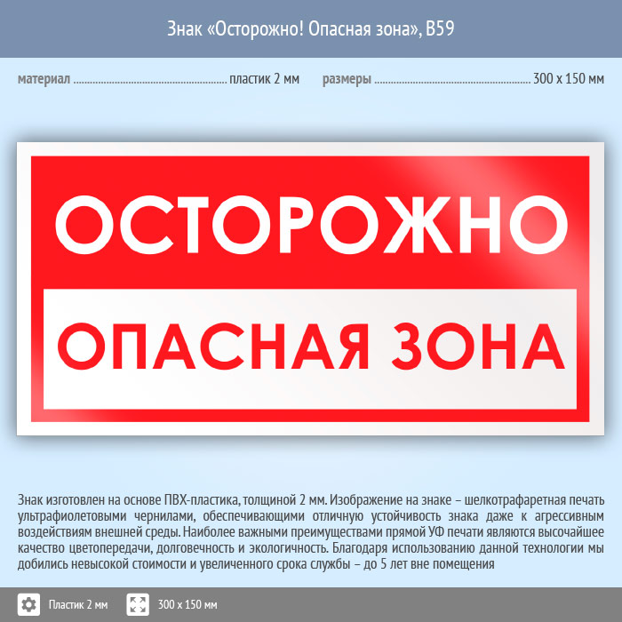 Знак «Осторожно! Опасная зона», B59 (пластик, 300х150 мм) в Рыбинске купить
