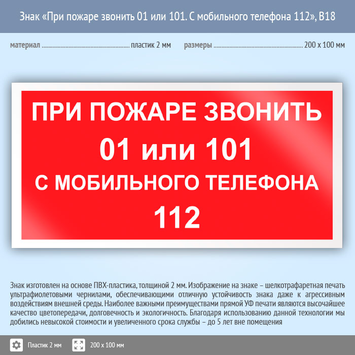 Знак «При пожаре звонить 01 или 101. С мобильного телефона 112», B18 (пластик, 200х100 мм) в Рыбинске купить