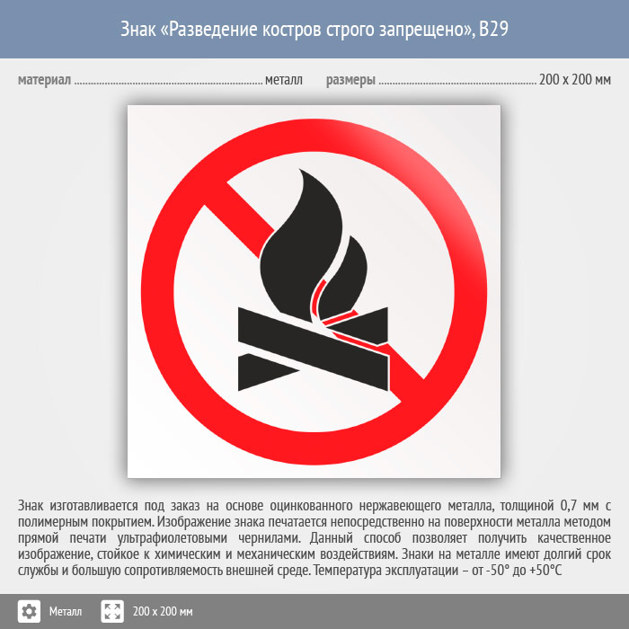 Знак «Разведение костров строго запрещено», B29 (металл, 200х200 мм) в Рыбинске купить