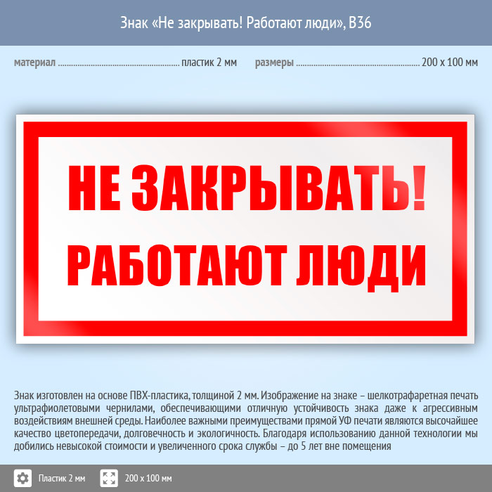 Знак «Не закрывать! Работают люди», B36 (пластик, 200х100 мм) в Рыбинске купить