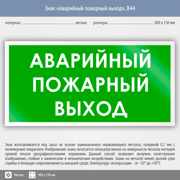 Знак «Аварийный пожарный выход», B44 (металл, 300х150 мм) в Рыбинске купить