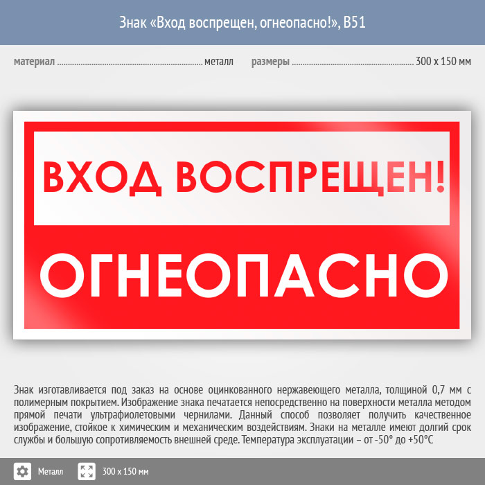 Знак «Вход воспрещен, огнеопасно!», B51 (металл, 300х150 мм) в Рыбинске купить
