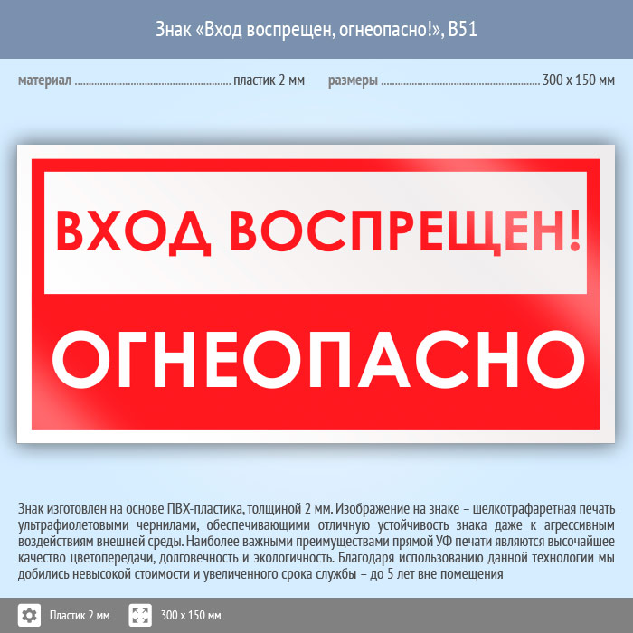 Знак «Вход воспрещен, огнеопасно!», B51 (пластик, 300х150 мм) в Рыбинске купить