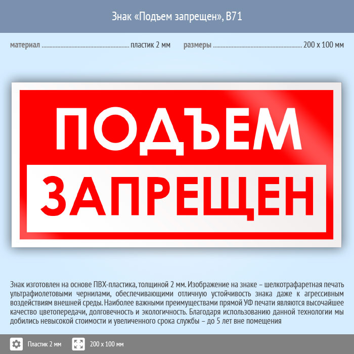 Знак «Подъем запрещен», B71 (пластик, 200х100 мм) в Рыбинске купить