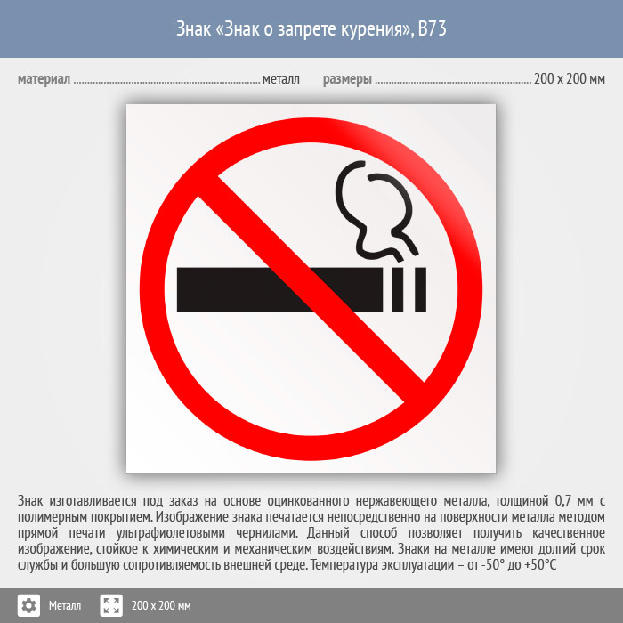 Знак «Знак о запрете курения», B73 (металл, 200х200 мм) в Рыбинске купить