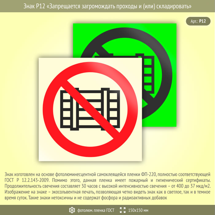 Знак P12 «Запрещается загромождать проходы и (или) складировать» (фотолюминесцентная пленка ГОСТ 34428-2018, 150х150 мм) в Рыбинске купить