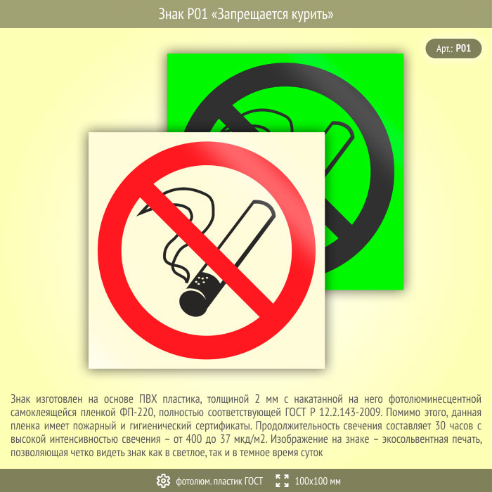 Знак P01 «Запрещается курить» (фотолюминесцентный пластик ГОСТ 34428-2018, 100х100 мм) в Рыбинске купить